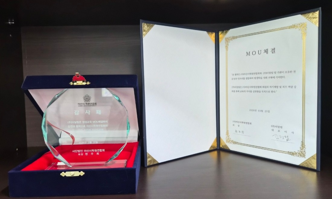 - 다음글[아산포커스] 아산시 학원연합회, 교육기관 '더알림과 MOU' 체결, 감사패 수여 26.04.03